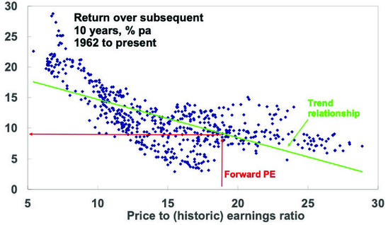 The next chart shows the same for Australian shares but only back to 1962 as an Australian PE series is not available prior to the 1960s. Again, there is the expected negative relationship between the level of the PE and subsequent total returns (based on the All Ords Accumulation Index) with the best returns coming after periods of low PEs. For example, at the end of the mid-1970s bear market in September 1974 the PE was just 5.4 times which was a great time to buy shares as over the next 10 years Australian shares returned 21.8% pa.