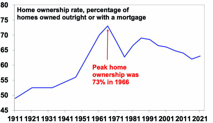In my view, the most interesting chart in the report is that of home ownership based on ABS Census data dating back to 1911 that Bernard Salt and his team discovered peaked around 1966. Just before World War One, Australia’s home ownership rate was just below 50%, but from even this relatively high rate it surged in the post-World War Two years to reach a peak of 73% in 1966 as home ownership was seen as delivering financial security after the malaise of the Great Depression and World War Two. As the report notes, at the time it was all about “getting married, having kids, buying a house and holding a steady job”. Retirement planning was rarely on the radar with life expectancy at around 70 in the late 1950s and early 1960s. In the aftermath of the Depression and World War Two, the concept of wealth was seen as tied up to owning a home. However, from the peak in 1966, housing affordability has trended down to now being around 63%.  The question is whether this decline reflects deteriorating housing affordability flowing from years of property booms, leading to a fading in the “Aussie dream” which is centred on home ownership or whether it’s something deeper.