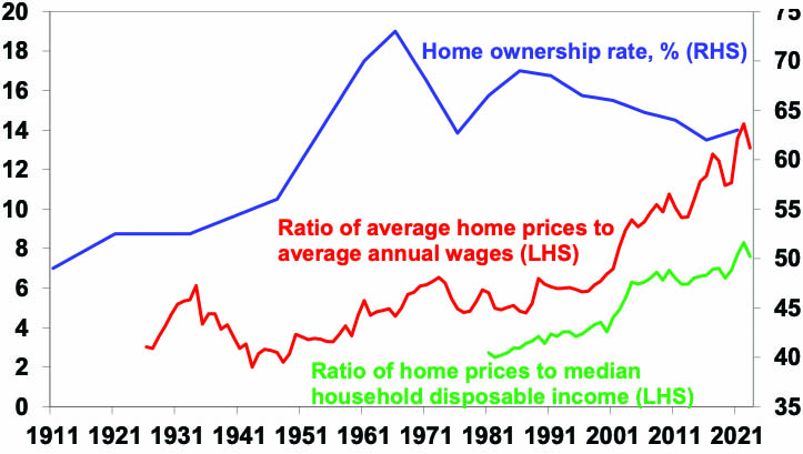 However, at the same time it’s hard to see housing affordability not impacting too. Trying to define housing affordability is always a bit of a challenge given the influence of house prices, income, interest rates and beneath that whether allowance is made for the rise of two income households and the increased availability of debt. But to keep things simple, it’s pretty clear that housing affordability has deteriorated massively since the 1990s. The first chart below shows the home ownership rate against two measures of housing affordability: the ratio of average home prices to average annual wages (in red); and the ratio of home prices to median household disposable income (green). The latter takes account of the rise in two income households, but data is not available before the 1980s. But the message from both is that since the 1990s there has been significant rise in the ratio home prices relative to incomes. Prior to the mid 1990s average home prices ranged around two to six times annual wages but since then it’s steadily increased to around 14 times. Similarly, the ratio of home prices to median household disposable income has blown out from around four times to eight times.