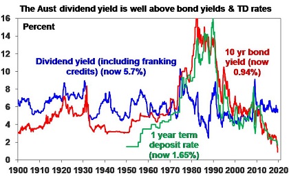 Finally, the decline in bond yields is making shares relatively cheap. The gap of 4.8% between the grossed-up dividend yield on Australian shares of 5.7% and the Australian 10-year bond yield of 0.94% is at a record high. Similarly, the gap between the grossed-up dividend yield and bank term deposit rates of less than 2% is very wide. In other words, relative to bonds and bank deposits shares are very cheap which should see them attract investor flows providing we are right and recession is avoided.
