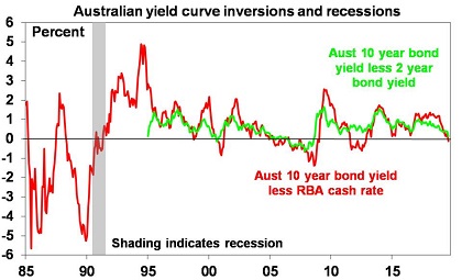 The Australian yield curve has also gone negative with 10-year bond yields of 0.94% below the cash rate of 1% but the gap between the 10 and 2-year bond yields only just positive. But it’s worth noting that Australian yield curve inversions around 1985, 2000, 2005-2008 and in 2012 were useless recession indicators.