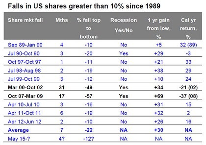 Excluding this year, since 1989 the US share market has experienced 10 falls of 10% or more. Of these, only the 49% fall between March 2000 & October 2002 and the 57% fall between October 2007 and March 2009 were bear markets, whereas those in 1990, 1997, 1998, 1999, 2010, 2011 and 2012 were corrections as a rising trend quickly resumed. Since December 1988 US shares have returned 10.3% pa (including dividends).