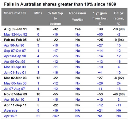 Much of the debate around share market declines concerns whether they are a correction or a bear market. Unfortunately there is no agreed definition of a correction versus a bear market – and certainly no “official” who makes declarations on this. My preferred approach is that a correction is limited to sharp falls, up to 20% or so, across a few months after which the rising trend in share prices resumes, taking shares back to new highs within say six months of the low. By contrast, a bear market sees falls lasting many months or years and it takes shares more than a year to gain new highs. Following this definition bear markets are highlighted in bold, corrections in blue. Falls less than 10% are not shown as they occur too frequently to be of interest.