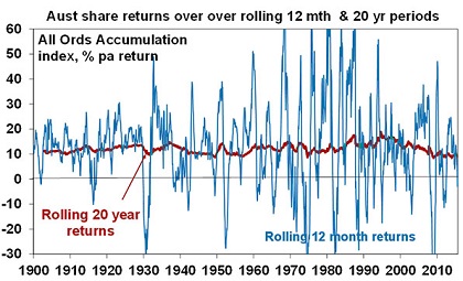 • Short term corrections and bear markets don’t equate to poor longer term returns from shares. Since December 1988 US shares have returned 10.3% pa and Australian shares 9.3% pa despite numerous corrections and bear markets. So while shares are highly volatile over short term periods their returns are more consistent and solid over long run periods. This can be seen in the next chart comparing annualised returns on Australian shares over rolling 12 month and 20 year periods. Whereas the rolling 12 month return bounces around violently, the rolling 20 year return is relatively stable.