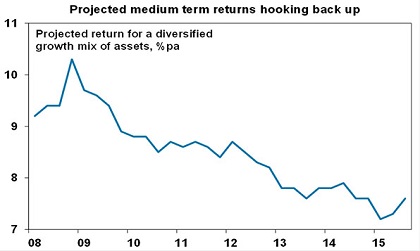 • Finally, while it is natural for investors to prefer rising share markets than falling, periods of decline and volatility are a necessary part of the way the share market works given the investor psychology that plays a huge role in pushing the share market to extremes at times relative to its long term rising trend. Essentially, periods of share market weakness stop investors from getting too euphoric, they provide a reminder that the outlook is not risk free and they help reset starting point values to provide a reasonable medium term return potential after periods when returns have run above average. In terms of the latter, the recent decline in share markets has pushed up the medium term (5 year) return potential from a diversified mix of assets from around 7% pa earlier this year to around 7.6% pa now. See the next chart. This is because when share prices are lower their return potential improves as dividends yields rise and shares trade on a lower price to earnings ratio. (Of course the return potential boost for a diversified mix of assets does not go up by more as the return potential from non-share asset classes are not or little affected by share market moves.)