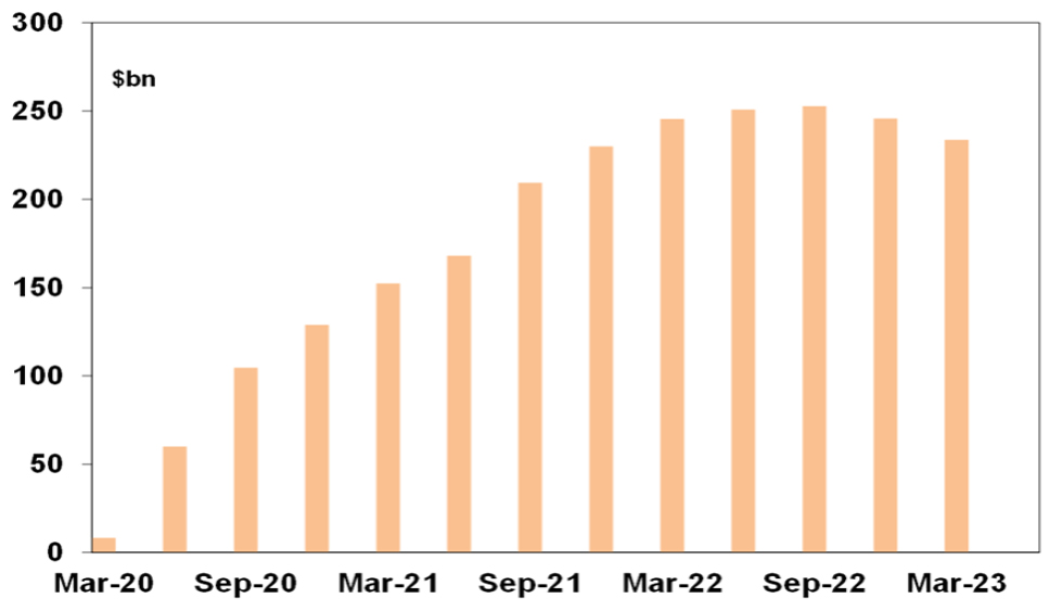Through the pandemic people were constrained from spending but most still received an income. The result was that household saving rates rose above normal levels resulting in excess saving. See the next chart. In Australia it has been run down but remains high at around $230bn. My concern has been and remains that it is not distributed equally and that for many younger (25-45 year old) households with high debt levels it has been rundown such that it’s no longer of any support in the face of the surge in interest payments. And for older households they are unlikely to use much of it for spending anyway. Nevertheless, at an average level it is a source of support that wasn’t around prior to past downturns.