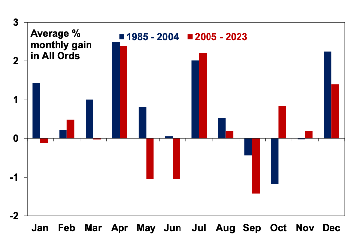 Seasonal patterns have long been observed in share markets. The “January effect” was perhaps the most famous, where January typically provided the best gains, but anticipation of it has seen it morph into December and now November. However, it’s really part of a broader seasonal pattern, which over long periods has been positive for shares from around October to around May and then weaker to September. This can partly be seen in the pattern of average monthly share prices changes since 1985 shown in the next chart.