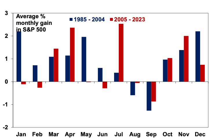 Secondly, the seasonal pattern has altered and softened a bit over time. The next chart compares the monthly pattern in returns over 2005-2023 to the period 1985-2004 for the Australian share market. May and June now appear to be weaker months, October’s weakness has been brought forward into September which is now the weakest month of the year (mainly because the October 1987 share crash drops out of the data for the latter period). But April, July and December remain the strongest months of the year, so some seasonal patterns still remain.