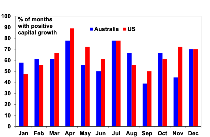 Since 1985, November, April and December have been the strongest months for US shares. August and September have been the weakest. Consistent with US shares’ global influence, this pattern is also discernible in other countries. The strongest months of the year in the Australia have been April, July and December, with September the weakest.