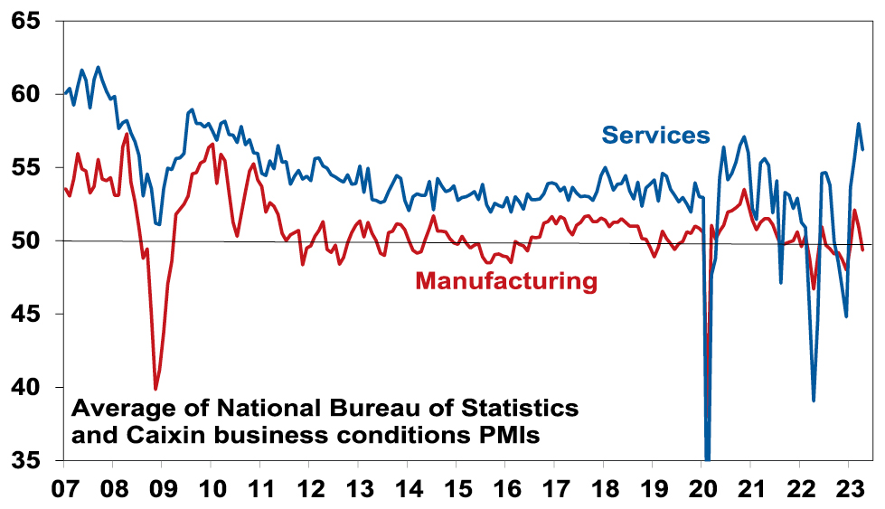 • Fourth, enthusiasm for AI has the potential to push share markets higher directly in terms of IT stocks that will benefit from related demand associated with an upgrade to AI, but also via a productivity boost to high labour industries that will boost growth and profits and lower wages. Of course, as we saw with the late 1990s tech boom the benefits could take time to materialise and investor interest could get frothy setting up a short term pullback.