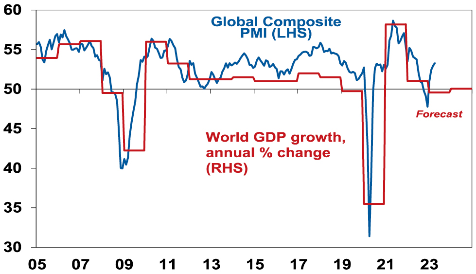 • Third, inflationary pressures look to have peaked and are receding. Business conditions PMI surveys show a continuing downtrend in input and output prices (for manufacturing and services), order backlogs are well down from their 2021-22 highs and delivery times are much improved. At the same time, labour markets are gradually becoming less tight with slowing job openings.