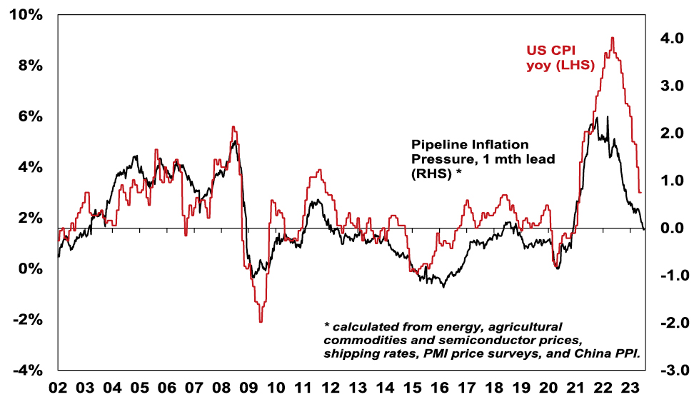 Australian inflation is lagging the US by 6 months, but our Australian Pipeline Inflation Indicator suggests inflation here will continue to fall. The RBA has started to soften its tightening bias & while we are allowing for a bit more on rates (given RBA worries about still high services inflation & the high risk of stronger wages growth), our assessment is that the RBA is either at or close to the top with rate cuts starting in February next year.