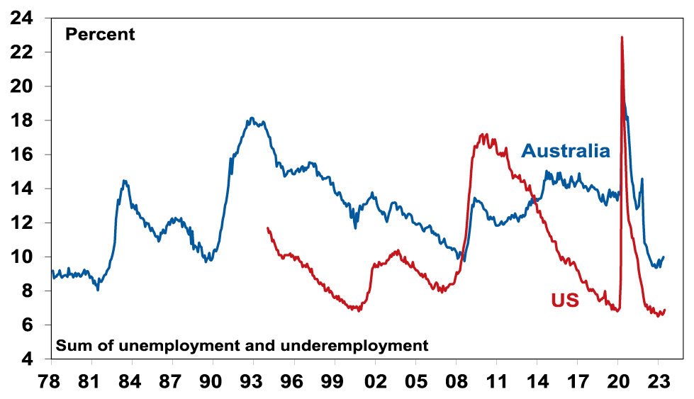 Also critical is the tightness of labour markets as this will determine wages growth which has a big impact on services inflation. If wages growth accelerates too much in response to high inflation, it risks locking in high inflation with a wage-price spiral which would make it harder to get inflation down. Unemployment and underemployment are key indicators of whether this will occur or not. Both remain low in the US & Australia (putting upwards pressure on wages), but there is increasing evidence that labour markets are cooling.  Wages growth is still rising in Australia (with the announcement effect of faster increases in minimum and award wages adding to this) but wages growth in the US looks to have peaked.
