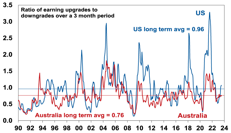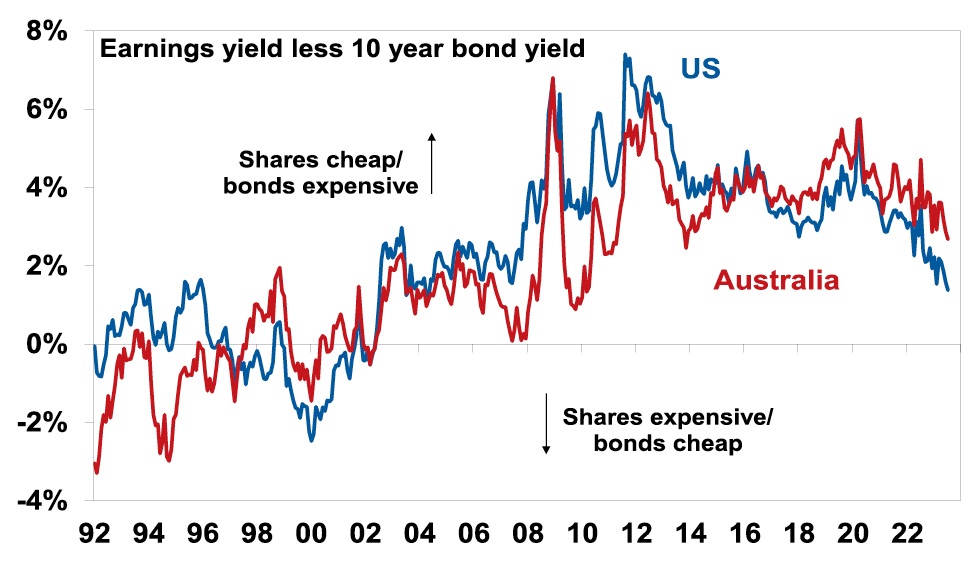 Since 2020, rising bond yields have weighed on share market valuations. As a result, the gap between earnings yields and bond yields (which is a proxy for shares’ risk premium) has narrowed to its lowest since the GFC in the US and Australia. Compared to the pre-GFC period shares still look cheap relative to bonds, but this is not the case compared to the post GFC period suggesting valuations may be a bit of a constraint to share market gains as current uncertainties suggests investors may demand a risk premium over bonds similar to that seen post GFC as opposed to what was seen pre GFC.  Australian share valuations look a bit more attractive than those in the US though helped by a higher earnings yield (or lower PEs). Ideally bond yields need to decline and earnings downgrades need to be limited.