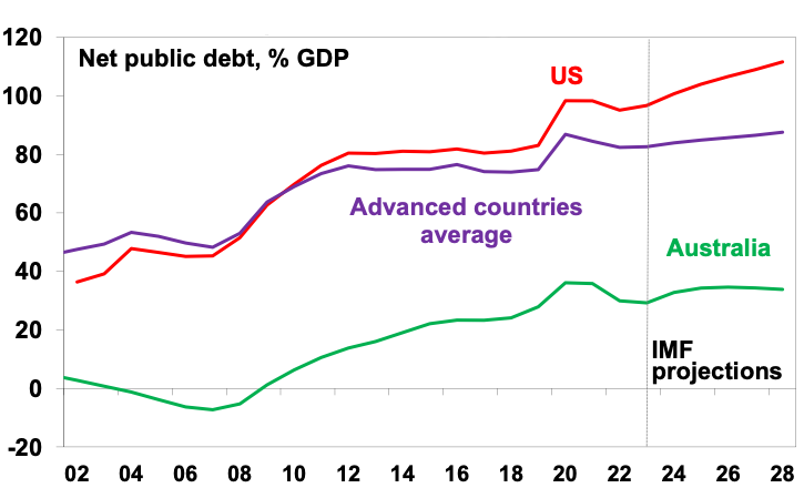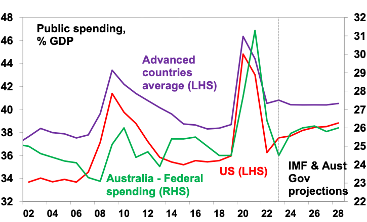 A big downside of the pandemic support programs was the surge in inflation. The combination of massive money printing along with a big increase in government payments to households (eg, Job Keeper) resulted in a massive boost to spending once lockdowns were lifted which combined with supply chain disruptions, also flowing from the pandemic, to cause a surge in inflation. Inflation is now starting to come under control as the monetary easing and spending boost has been reversed and supply has improved again but the pandemic has likely ushered in a more inflation prone world by: boosting “bigger” government; adding to a reversal in globalisation; and adding to geopolitical tensions. All of which combine with aging populations to potentially result in more inflation.