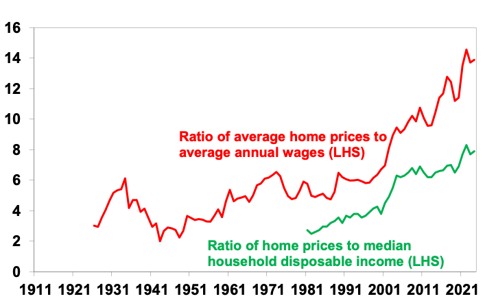 At the start of the pandemic, it was thought the economic downturn and higher unemployment and a freeze in immigration would cause a collapse in home prices and they did initially fall. But not by much as it was quickly turned around by policy measures to support household income, allow a pause in mortgage payments and slash interest rates and mortgage rates to record lows. What’s more the lockdowns and working from home drove increased demand for houses over units and interest in smaller cities and regional locations. As a result, Australian home prices surged to record levels. Meanwhile the impact of higher interest rates in the last two years on home prices was swamped by housing shortages as immigration surged in a catch up. The end result is now record low levels of housing affordability for buyers (who are hit by a double whammy of higher prices relative to incomes – see the next chart – and higher mortgages rates) and renters (who have seen surging rents).
