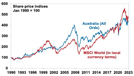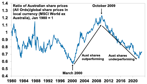 After underperforming global shares in the tech boom in the second half of the 1990s, Australian shares came roaring back in the 2000’s resources boom. This meant the 2007 high for Australian shares was a much higher high than for global shares which spun their wheels in the 2000s. So, the poor relative performance of Australian shares since 2009 is partly payback for their outperformance in the 2000s.