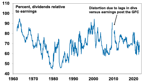An often expressed view is that Australian companies are not investing because shareholders want high dividends and this could be causing poor profit growth & share returns. This is unlikely. The dividend payout ratio (ie dividends relative to earnings) is not out of line with its historic norm.