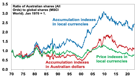 In fact, because Australian shares pay relatively high dividend yields (around 4.4%) compared to global shares (2.5%) they should be included in comparisons of Australian with global share market returns. The next chart compares the relative performance of Australian to global shares since 1970 in terms of: relative share prices in local currency terms (green line); relative total returns ie with dividends added in (blue line); and relative total returns with global shares in Australian dollars (red line).