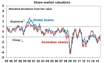 First, after sharp falls in share markets and falls in bond yields share valuations have become quite attractive. Our valuation measures for global and Australian shares have fallen back into very cheap territory.