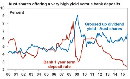The gap between the grossed up dividend yield on Australian shares (which is now around 6.5%) and term deposit rates (around 2.5%) is now at its highest level since the GFC.