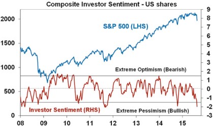 Second, investor confidence has rapidly collapsed as evident by all the talk of global calamity. In fact a measure of investor sentiment based on various surveys and indicators of fear that we track has fallen to levels often associated with market bottoms. This is positive from a contrarian perspective.
