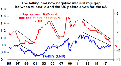 Our view for some time is that the RBA won’t raise interest rates until 2020 at the earliest. In terms of growth, a brightening outlook for mining investment, strengthening non-mining investment, booming infrastructure spending and strong growth in export volumes are all positive but are likely to be offset by topping dwelling investment and constrained consumer spending. As a result, growth is likely to average around 2.5-3% which is below RBA expectations for growth to move up to 3.25%. This in turn means that spare capacity in the economy will remain high – notably unemployment and underemployment at 13.9% – which will keep wages growth low and inflation down. On top of this house prices likely have more downside in Sydney and Melbourne over the next two years, banks are tightening lending standards which is resulting in a defacto monetary tightening and the risks of a US-driven trade war are posing downside risks to the global growth outlook. As such we remain of the view that a rate hike is unlikely before 2020 at the earliest and can’t rule out the next move being a cut.