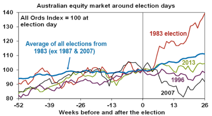 However, the elections resulting in a change of government have seen a mixed picture. Shares rose sharply after the 1983 Labor victory but fell sharply after the 2007 Labor win, with global developments playing a role in both. After the 1996 and 2013 Coalition victories shares were flat to down. So based on historical experience it’s not obvious that a victory by any one party is best for shares in the short term and historically the impact of swings in global shares arguably played a bigger role than the outcomes of Federal elections.
