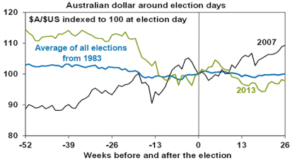 In terms of the share market, there is some evidence of it tracking sideways in the run up to elections, which may be because investors don’t like the uncertainty associated with the prospect of a change in economic policies. The next chart shows Australian share prices from one year prior to six months after federal elections since 1983. This is shown as an average for all elections (but excludes the 1987 and 2007 elections given the global share crash in late 1987 and the start of the global financial crisis in 2007), and the periods around the 1983 and 2007 elections, which saw a change of government to Labor, and the 1996 and 2013 elections, which saw a change of government to the Coalition. The chart suggests some evidence of a period of flat lining in the run up to elections, possibly reflecting investor uncertainty beforehand, followed by a relief rally soon after.