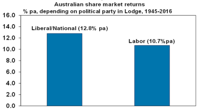It may be argued that the Labor governments led by Whitlam in the 1970s and Rudd and Gillard more recently had the misfortune of severe global bear markets and, if these periods are excluded, the Labor average rises to 15.8% pa. Then again that may be pushing things a bit too far. But certainly the Hawke/Keating government defied conventional perceptions that conservative governments are always better for shares. Over the Hawke/Keating period from 1983 to 1996 Australian shares returned 17.3% pa, the strongest pace for any post-war Australian government.