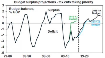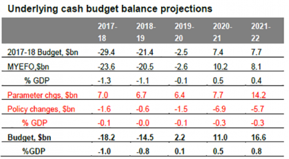Thanks to stronger corporate revenue (due to reduced tax losses and higher commodity prices), stronger personal tax revenue thanks to higher employment and reduced spending the 2017-18 budget deficit is projected to come in at $18.2bn compared to $23.6bn in the Mid-Year review. The Government has assumed that much of this revenue boost will continue (see the “parameter changes” line in the table below) but has only used a bit of it to fund tax cuts and other measures. The net result is that the budget is projected to continue to track to a surplus – which is now expected to be reached one year earlier in 2019-20 albeit its only wafer thin at $2.2bn or 0.1% of GDP. The move back to surplus is slowed slightly by the fiscal easing from policy changes (predominately tax cuts). For example the 2018-19 deficit is projected to fall to $14.5bn but it would have fallen to $13.8bn were it not for the fiscal easing. That said the fiscal easing is small at 0.1 to 0.3% of GDP over the next few years and the progressive shift from deficit to surplus will mean that it will take more out of the economy than its putting back in.