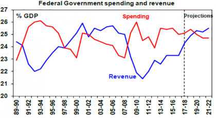The main risks though are that we still be seeing a record run of 11 years of budget deficits. While our net public debt to GDP ratio is low at 19% compared to 81% in the US, 69% in the Eurozone and 153% in Japan, comparing ourselves to a bad bunch is dangerous and they are all a bit different with Europe and Japan borrowing from themselves and the US benefitting from its reserve currency status. The run of deficits being projected in the Budget still swamps those of the 1980s and 1990s. And this is without the deep recessions of the early 1980s and 1990s! Rather we have achieved this thanks to a combination of ramping up spending on a whole range of things without facing up to how they will be paid for. Unlike prior to the GFC we have nothing put aside for a rainy day (when net public debt was negative) and there is a risk that the revenue surprise seen lately will prove temporary if global growth or employment slows. This may particularly be a risk around 2020 if the global economy starts to slow again in response to Fed tightening.