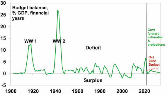 This Budget like all of those since 2020 has benefitted from huge revenue flows coming from a combination of higher personal tax collections due to stronger jobs and wages growth, higher commodity prices and higher non-mining profits than assumed. It looks like “rivers of gold” flowing to Canberra, but it’s really good luck flowing from conservative forecasts regarding jobs, wages, inflation and commodity prices. This windfall (see the line called “parameter changes” in the next table) is estimated to reduce the deficit this financial year by $42bn compared to last October’s forecast, with carry over to next year before slowing as unemployment rises. Some of the windfall has been spent (see the line called “new stimulus”) but 86% of it out to 2026-27 has been saved. As a result, the budget is now projected to be in surplus for this year – its first since 2007-08, a massive turnaround from the $99bn deficit projected less than 18 months ago and the fastest improvement as a share of GDP since the end of WW2 when the deficit went from 10.5% of GDP in 1944-45 to 0.8% in 1946-47. While there is net new stimulus going forward (mainly in 2024-25) due to the cost-of-living measures it turns negative by 2026-27 (as Budget savings kick in) and over the next four years is swamped by the revenue windfall resulting in lower budget deficits going forward.