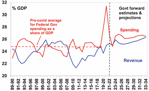 Projections for spending as a share of GDP remain above the pre-Covid average of 24.8% but are lower than previously with Budget measures restricting spending growth to 0.6%pa out to 2026-27. Revenue trends higher (partly due to tax measures in the Budget) as a share of GDP reaching its 1986-87 record of 26.2% in a decade.