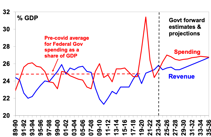 Due to new spending & structural pressures from interest costs, the NDIS, defence, health and aged care, spending as a share of GDP is expected to average 26.7% over the longer term, well above the pre-Covid average of 24.8%. Despite another blip down with mini tax cuts, revenue starts trending up from 2028-29 reaching a record 26.7% of GDP in a decade as bracket creep kicks in again. So bracket creep, not spending restraint is still assumed to do the work in getting us back to balance.
