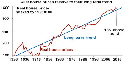 Real house prices have been running above trend since 2003. While the excess above trend eased from 2010 it has blown out again in the last two years.