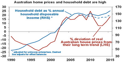 The shift to overvaluation has come higher household debt. The next chart shows the deviation in house prices from their long term trend against the ratio of household debt to income.