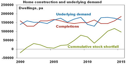 Third, a more fundamental factor explaining the persistence of “overvalued” home prices in Australia relative to other countries is constrained supply. Australia has had a chronic undersupply which has been worsening until recently. This can be seen in the next chart which tracks housing starts versus underlying demand. The cumulative undersupply on this measure reached above 100,000 dwellings last year. The main reason behind the slow supply response appears to be tough land use regulations in Australia.