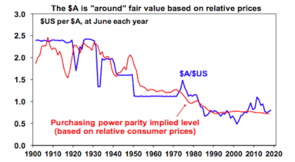But returning to the Australian dollar, in a big picture sense it’s not way out of whack with long-term fair value based on relative prices or what is referred to as purchasing power parity. This can be seen in the next chart, which shows where the $A should have been over time if it had moved to equilibrate relative consumer price levels between the US and Australia. Right now, fair value on this measure is around $US0.75, so at around $US0.80 it’s hard to get too excited given that purchasing power parity is only a rough guide.