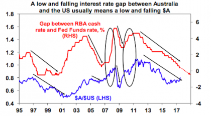 As a result, the RBA is far from tightening. In fact, in its post-August meeting statement it noted that a rising $A “would be expected to result in a slower pick-up in economic activity and inflation than currently forecast”. In other words, the rising $A is a defacto monetary tightening that will mean a lower profile for the cash rate than would otherwise have been the case. And meanwhile with US economic indicators remaining solid and the Fed is likely to continue raising rates and start reversing quantitative easing next month. So a resumption of the falling interest rate differential between Australia and the US is likely. As the next chart shows, periods of a falling official interest rate differential between Australia and the US usually see a falling Australian dollar (see black arrows) – not in a straight line, but over time. By contrast surges in the value of the $A (eg 2007-2008 and 2009-2011 – both circled) are associated with rising rates in Australia relative to the US and there is no sign of that.