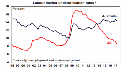 The huge difference between the Australian and US economies at present can be seen in broad measures of labour market underutilisation. In Australia, the combination of unemployment and underemployment is about as high as it ever gets, whereas in the US its nearing as low as it ever gets, which is consistent with falling interest rates in Australia relative to the US. Back in 2007, when the $A was on its way towards parity, the Australian labour market was rapidly tightening with labour market underutilisation heading to a record low.