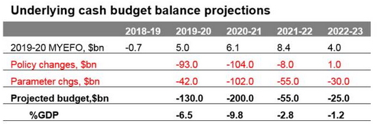 Put simply, the Government’s necessary fiscal support response and the hit to the budget flowing from the hit to the economy will see the budget deficit blow out to around $130bn this year and $200bn next financial year, before falling sharply from 2021-22, as support programs end and the economy recovers.