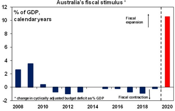 Second, it makes sense for the public sector to borrow from households and businesses at a time when they are stuck at home and can’t spend due to the shutdown or won’t spend due to uncertainty, and for the Government to give the borrowed funds to help those businesses and individuals that are directly impacted. Using the funds to subsidise wages was a very smart move as it keeps people employed, keeps them linked to their employer and helps minimize confidence zapping unemployment headlines.