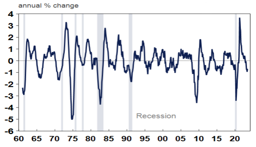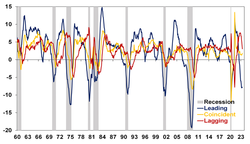 And so it is right now in the US with leading indicators depressed, coincident indicators having slowed but still growing and lagging indicators having slowed recently but still around pre-pandemic levels. It’s a similar story in Australia with the Westpac/Melbourne Institute leading index having slowed but GDP growth still positive.