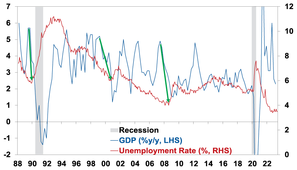 Recent Australian jobs data has been strong with employment up 3%yoy, hours worked up 4.7%yoy and unemployment around a near 50 year low of 3.5%. For much of the last thirty years, Australia has not had a lot of clearly defined economic cycles and unemployment was in a downtrend. The pandemic also distorted normal economic relationships. However, as can be seen in the next chart significant swings in unemployment around the early 1990s recession and the early 2000s and 2008 growth slowdowns saw unemployment tend to lag swings in GDP growth (eg, see the green arrows). This was particularly evident around the early 1990s recession with unemployment still going down as GDP slowed in 1989 and only starting to rise in earnest once the economy was in recession. After the recession ended in mid-1991, unemployment did not peak until late 1992.