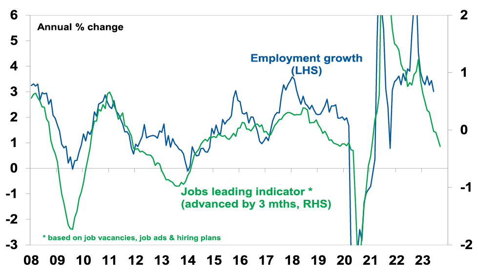 Our leading indicator of jobs growth – based on vacancies and hiring plans – points to a sharp slowing in jobs growth ahead.