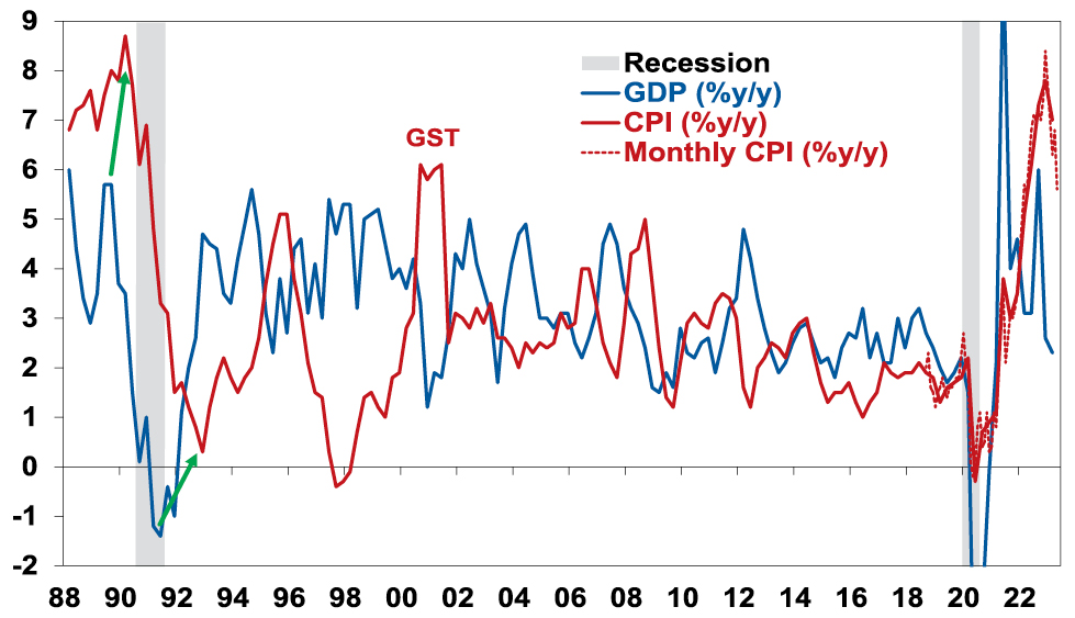 As with unemployment, major swings in inflation also tend to lag major swings in GDP growth. Of course, as already noted Australia didn’t have a lot of clear economic cycles over the last 30 years, but the lag was clearly evident in the early 1990s (see the green arrows below). Of course, the pandemic distorted things pushing inflation down very quickly in 2020 and the combination of pandemic related distortions, floods and the war in Ukraine which depressed supply helped boost inflation since 2021 but the supply side is now normalising.
