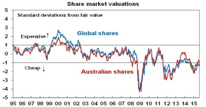 The important issue though is whether current weakness is just a correction or the start of a new bear market? Periodic sharp falls in the range of 5% to even 20% are quite normal and healthy in that they help the market let off steam and the rising trend resume. Of course it becomes more concerning if the rising trend in share prices gives way to a declining trend and a new bear market sets in. On this front our view remains that the cyclical bull market in shares likely has further to go. Put simply shares are not seeing the sort of conditions that normally precede a new cyclical bear market: shares are not unambiguously overvalued; they are not over loved by investors; uneven & below trend growth is extending the economic expansion cycle; and monetary conditions are likely to remain easy for a while yet. Looking at each of these in turn.