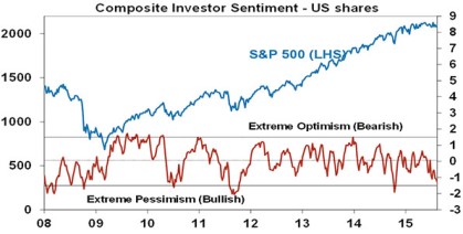 Finally, shares are a long way from being over loved. Sir John Templeton once observed that “bull markets are born on pessimism, grow on scepticism, mature on optimism and die of euphoria”. There still looks to be a lot of scepticism out there and in my travels in recent times I am yet to find a cabbie piling into shares (one of the best guides to when we have hit euphoria). In fact various measures of investor sentiment that we track are showing high levels of pessimism which is a bullish sign from a contrarian perspective. (See the next chart.) This is particularly the case in relation to Asian and emerging market shares.