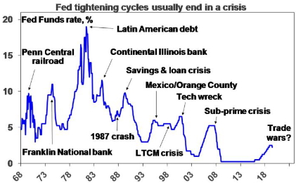 The pattern of the past 50 years or so is for the Fed to cut rates after some form of crisis threatens the economic outlook. See the next chart. In 2001 it was the tech wreck and in 2007 it was the sub-prime mortgage crisis. This time around there is nothing on that scale although it may be argued that the trade wars are providing the biggest single threat.